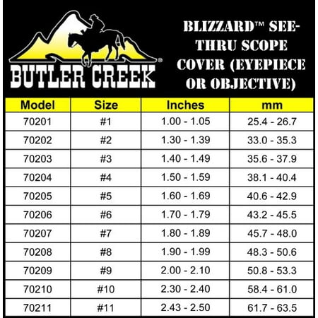 Butler creek blizzard scope cover chart. Please consult your retailer if you have any questions. To convert from inches to millimeters, take the measurement in inches and multiply by 25.4. Butler’s creek with flip prostaff: